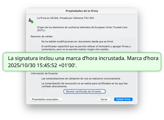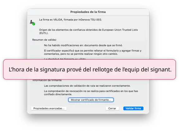 La marca de temps que apareix en signar amb Adobe prové del mateix equip de l’usuari, no d’una font certificada.