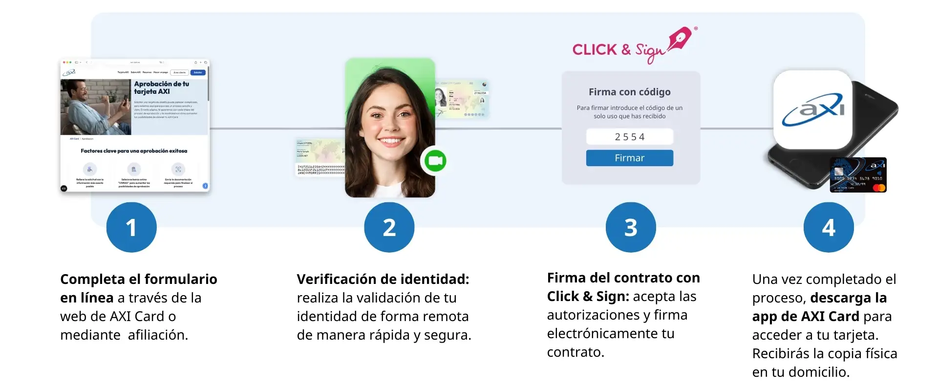 El cliente inicia el proceso de contratación completando un formulario en línea directamente desde la web de AXI Card, o a través de afiliación. A continuación, se llevan a cabo de forma totalmente digital y en un entorno seguro los pasos de validación de identidad, aceptación de autorizaciones y firma electrónica del contrato mediante Click & Sign. Una vez finalizado el proceso, el cliente puede descargar la app de AXI Card, donde encontrará su tarjeta activa y podrá gestionarla de manera sencilla e intuitiva.